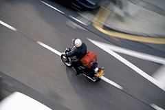 На нем можно заметить человека в желтой каске на мотоцикле, а также с рюкзаком на спине. Предположительно, он является курьером одной из служб, занимающихся доставкой еды.