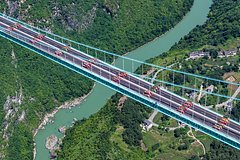 Подвесной мост, который еще до официального открытия приобрел статус рекордно высокого, построен на скоростной трассе Лючжи–Аньлонг в провинции Гуйчжоу на юго-западе Китая. Мост проходит над Большим каньоном Хуацзян, возвышаясь над ущельем на 625 метров. Общая длина переправы составляет 2,9 километра, а главный его пролет достигает рекордного 1,4 километра. Несущие элементы выполнены из стали и включают 93 сегмента общим весом около 22 тысяч тонн, что эквивалентно двум Эйфелевым башням.